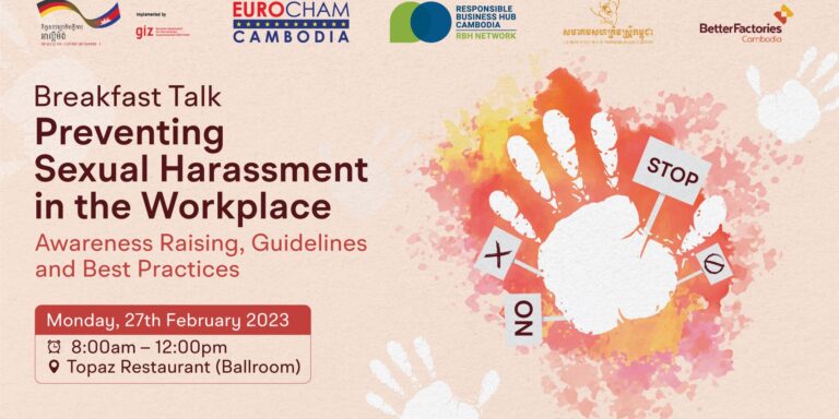 早餐讲座:拒绝职场性骚扰 可持续业务中心(总部位于欧盟商会)与柬埔寨女企业家协会 (CWEA) 及国际劳工组织 (ILO) 合作,于 2023 年 2 月 27 日在 Topaz 餐厅共同举办以“拒绝职场性骚扰”为主题的早餐讲座活动。 阅读更多